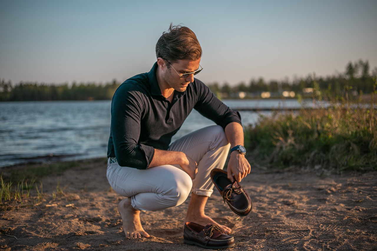 Wypróbowałem jednak moje boat shoes na plaży i nosi się je świetnie, nawet bez skarpety. Jeśli wybierasz się nad wodę i masz ochotę szybko zdjąć buty, by zamoczyć stopy – nic prostszego. Dotychczas brakowało mi takich butów. Klasyczne boat shoes nigdy nie były priorytetem w mojej garderobie, ale odkąd je mam, noszę je bardzo często.